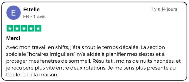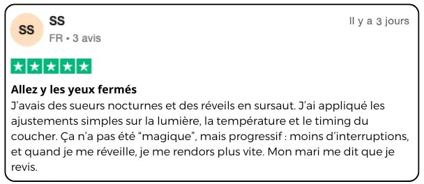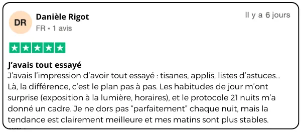 Les témoignages et exemples présentés sur cette page reflètent des expériences réelles d’utilisatrices de Le Protocole 21 Nuits, mais ne constituent pas une garantie. Vos résultats personnels peuvent différer sensiblement.